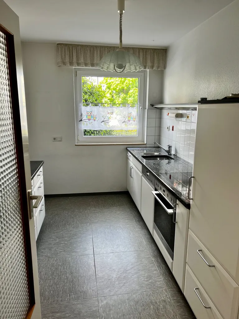 Angrenzend befindet sich die gut ausgestattete Küche mit Miele-Geräten, Granit-Arbeitsplatte und vielen Schrankfächer und Schubladen mit modernen weißen Fronten.
