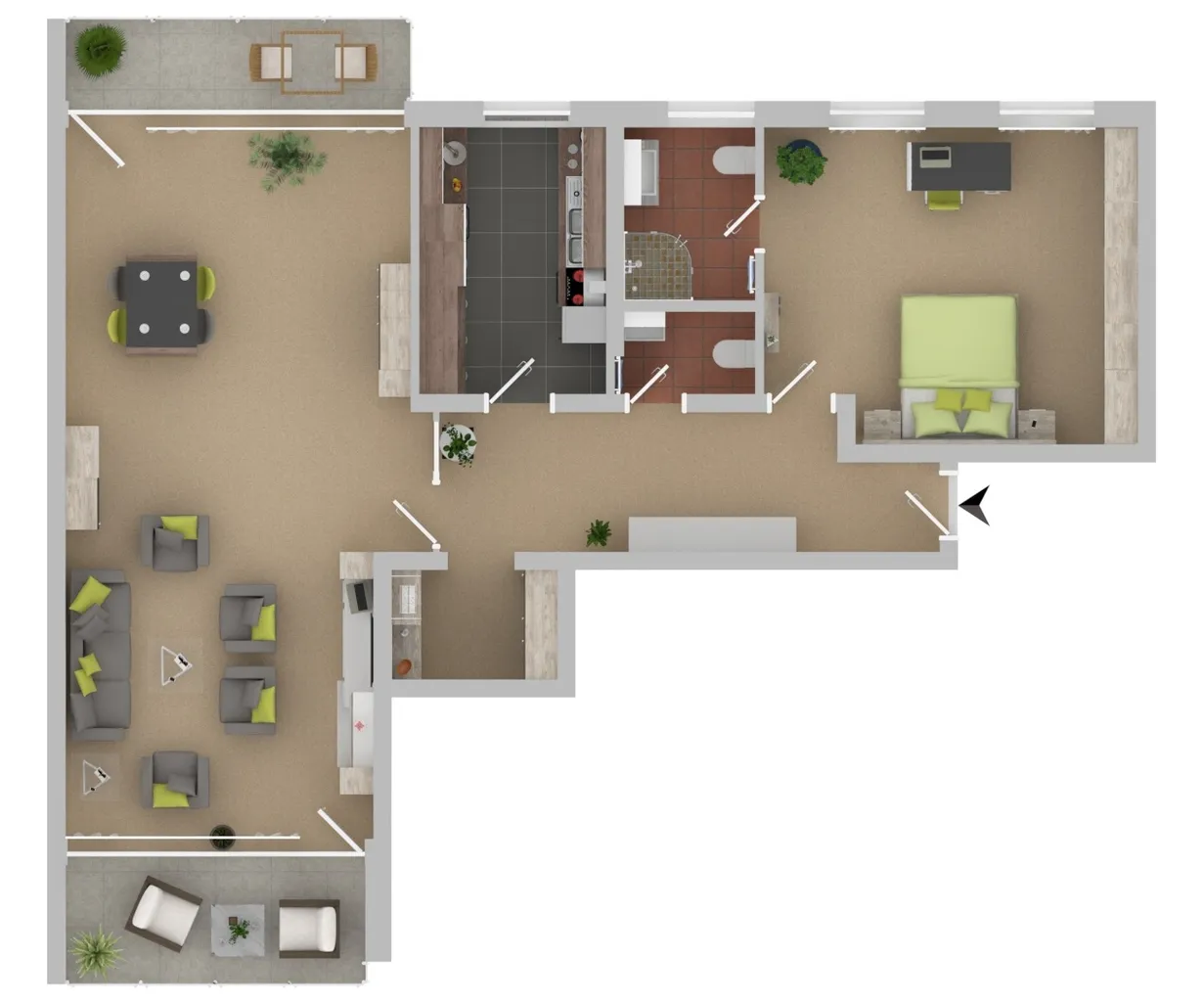 Diese helle und geräumige 2 Zimmerwohnung befindet sich in einem ruhigen und gepflegten Mehrfamilienhaus. Von dem großzügigen Flur mit einer Breite von ca. 2 Metern, erreichen Sie alle Räume. Das geräumige Schlafzimmer mit seinem modernen Bad en Suite liegt rechts von dem Eingang.
