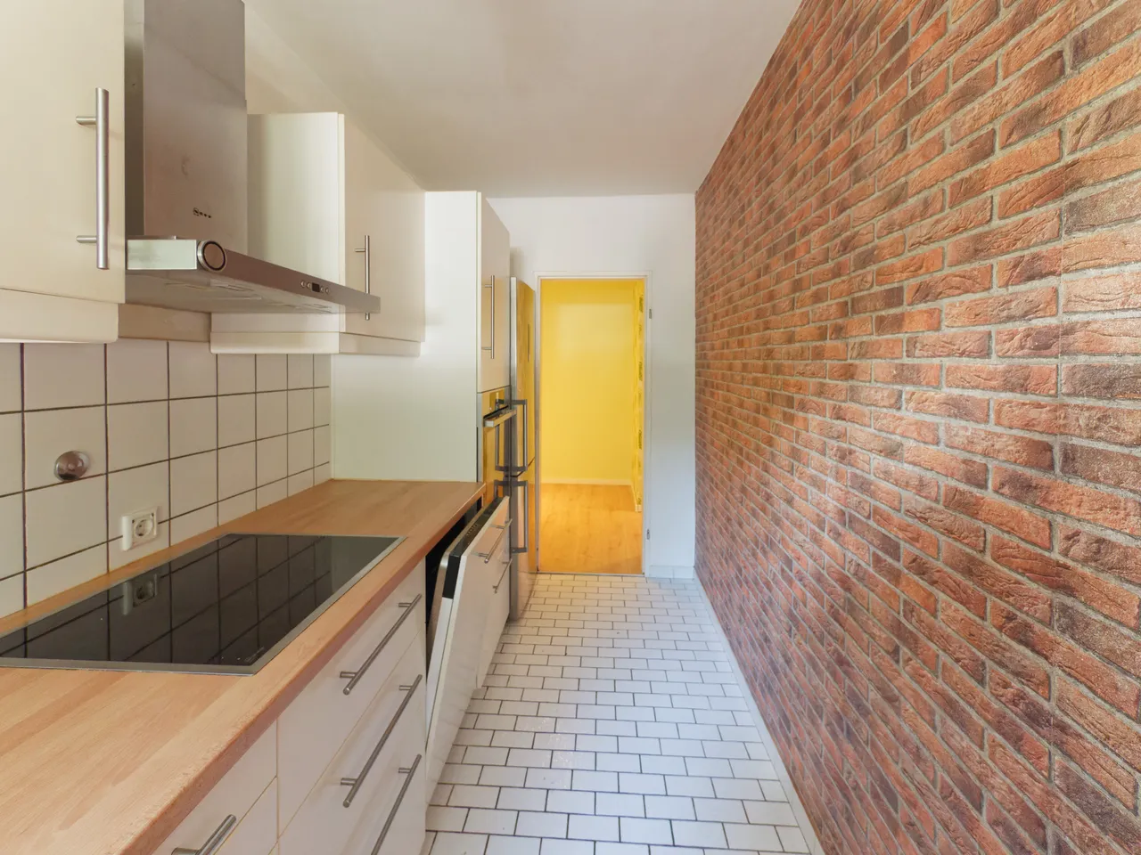 Beginnend vom Flur aus, welcher Platz für einen großen Wandschrank oder für eine Garderobe bietet, liegt auf der linken Seite die geräumige Küche. Sie hat neben einer Einbauküche, die im Verkaufspreis enthalten ist, eine Wand mit Klinkersteinen als Eyecatcher.