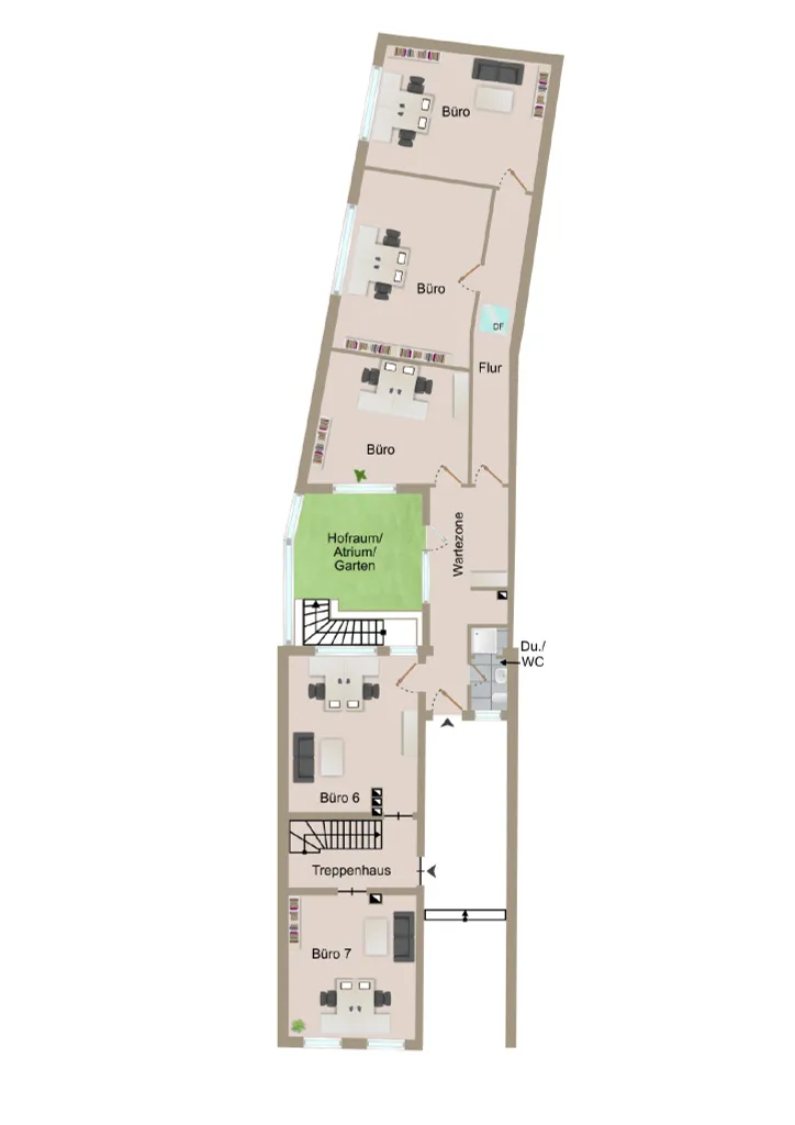 Das Erdgeschoss umfasst rund 168 m², wovon zuletzt etwa 135 m² als Büro genutzt wurden. Damit eröffnet der Anbau drei Optionen: Sie können die Fläche selbst als Wohnraum, Kanzlei, Agentur oder Praxis nutzen, sie separat vermieten oder den Rückbau wagen und einen privaten Stadtgarten schaffen. Besonders hervorzuheben ist das Atrium als architektonisches Highlight, das Licht und Offenheit ins Haus bringt