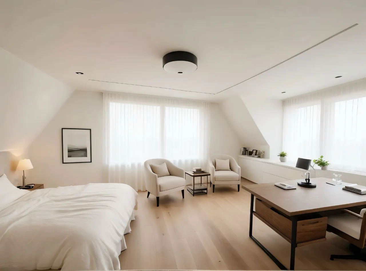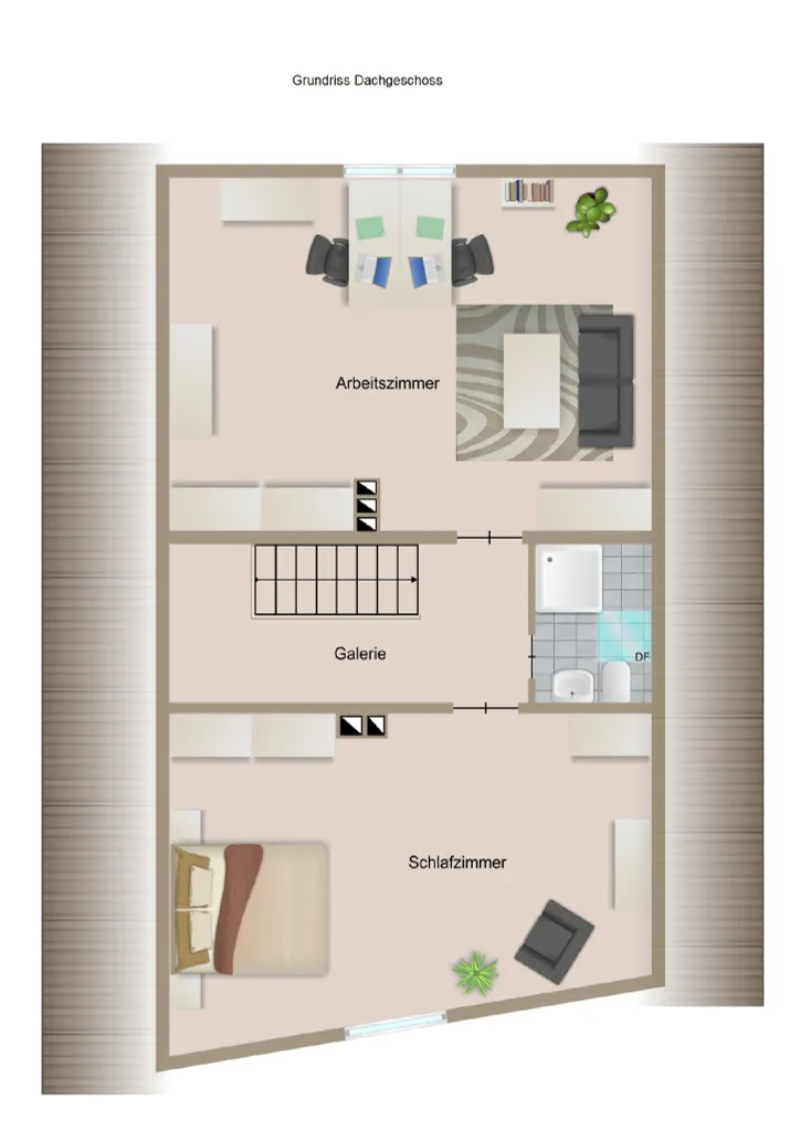 Im Dachgeschoss finden Sie eine Galerie, ein helles Arbeitszimmer sowie ein großes Schlafzimmer mit eigenem Bad. Die Räume wirken durch die Dachschrägen besonders wohnlich und bieten viel Privatsphäre.