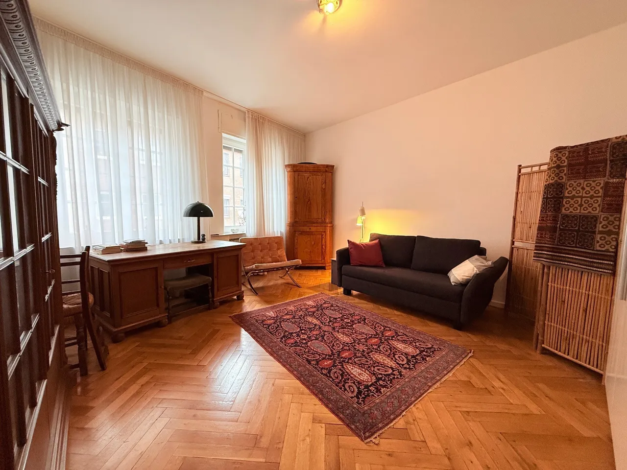 Schon beim Betreten spürt man den Charakter. Hohe Decken, edles Fischgrätparkett, Solnhofer Platten und massive Vollholztüren schaffen eine Atmosphäre, die Geschichte und Stilbewusstsein atmet. Jedes Zimmer erzählt von Großzügigkeit und gibt Raum für neue Ideen.
