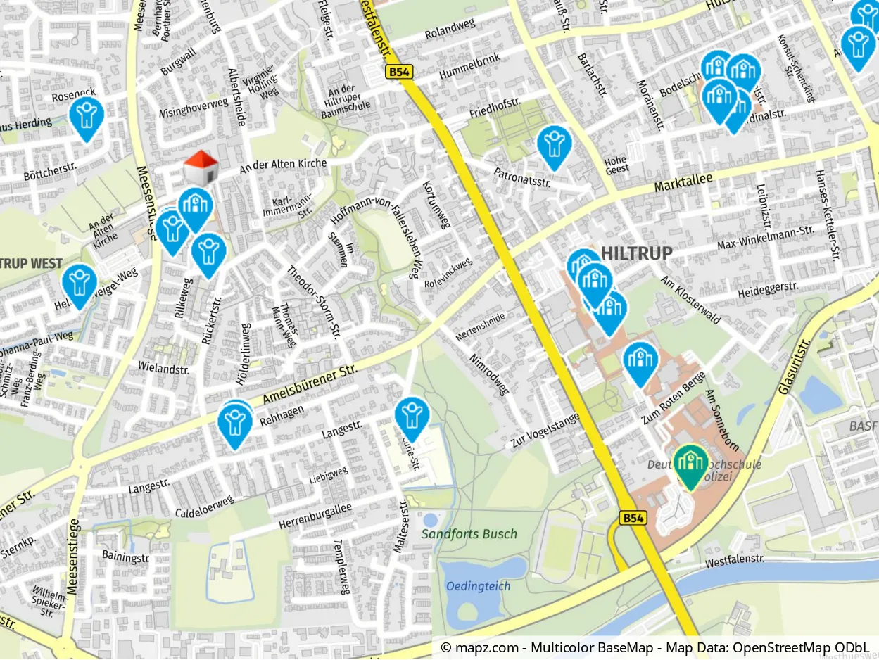 Im direkten Umfeld oder auf Hiltrups Haupteinkaufsstraße, der Marktallee, finden Sie ebenfalls alles für den täglichen Bedarf und ein ausreichendes Ärzteangebot. Das Hallenbad, ein großes beliebtes Freibad, die Stadthalle und vielfältige Sportmöglichkeiten sind weitere Gründe, warum dieser Stadtteil so beliebt ist. Die nahen Waldgebiete und der Dortmund-Ems-Kanal bieten außerdem attraktive Erholungsmöglichkeiten.