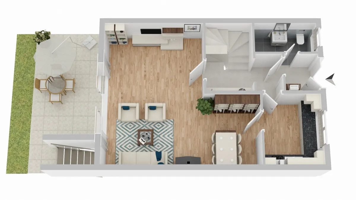Im Erdgeschoss erwartet Sie eine separate Küche, ein Gäste-WC mit Dusche sowie ein lichtdurchflutetes Wohn-/ Esszimmer mit bodentiefen Schiebetürenelementen und einem offenen Kamin. Von hier aus gelangen Sie auf die große, sonnige Terrasse und in den Garten, um entspannte Stunden im Freien zu genießen