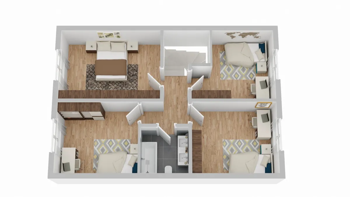 Im Obergeschoss stehen Ihnen vier gut geschnittene Zimmer zur Verfügung, die flexibel als Schlaf-, Kinder- oder Arbeitszimmer genutzt werden können. Ein Badezimmer komplettiert diese Etage.