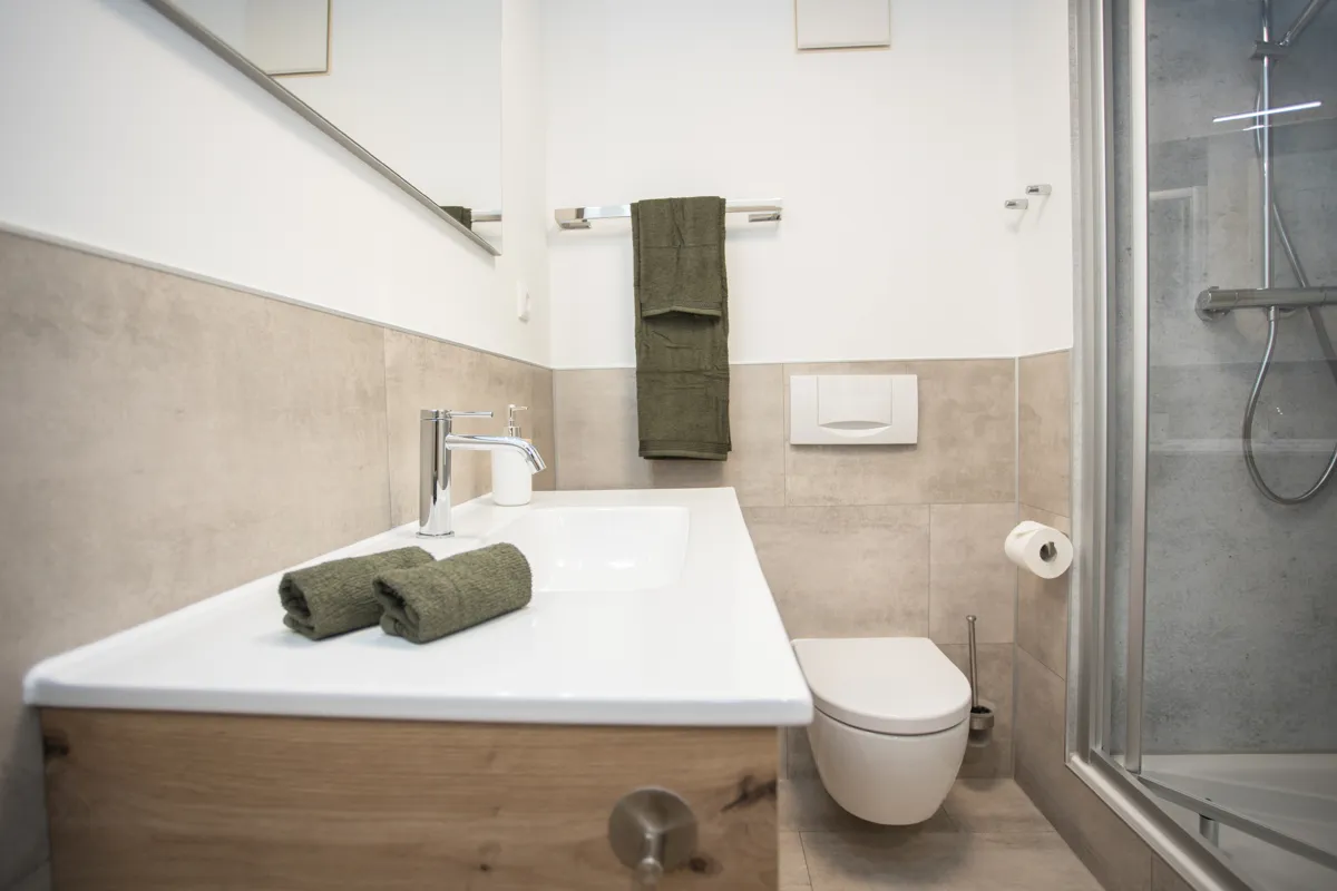 Der offene Wohn- und Essbereich wirkt durch viel Tageslicht und warme Holzoberflächen besonders einladend. Eine hochwertige Einbauküche, ein großer Holzesstisch, eine komfortable Schlafcouch und der Zugang zur geschützten Loggia schaffen ein harmonisches Gesamtbild. Das Schlafzimmer verfügt über ein Doppelbett, einen großen Einbauschrank und einen Schreibtisch. Das modernisierte Bad überzeugt mit einer Dusche inklusive Kopfbrause, einem stilvollen Waschtisch und praktischen Stauraumlösungen. Eine Garderobennische im Flur ergänzt den funktionalen Grundriss.