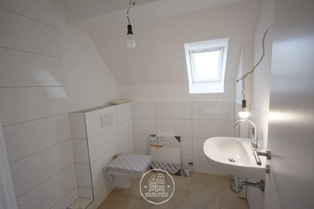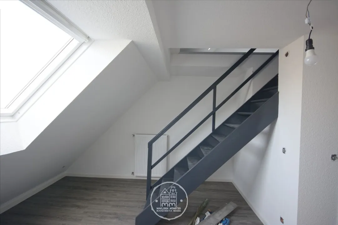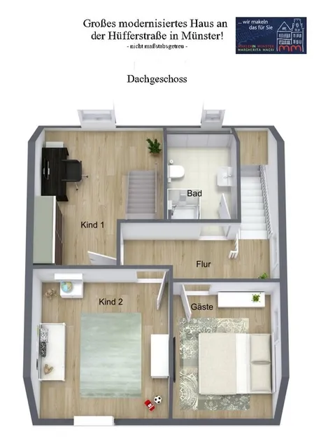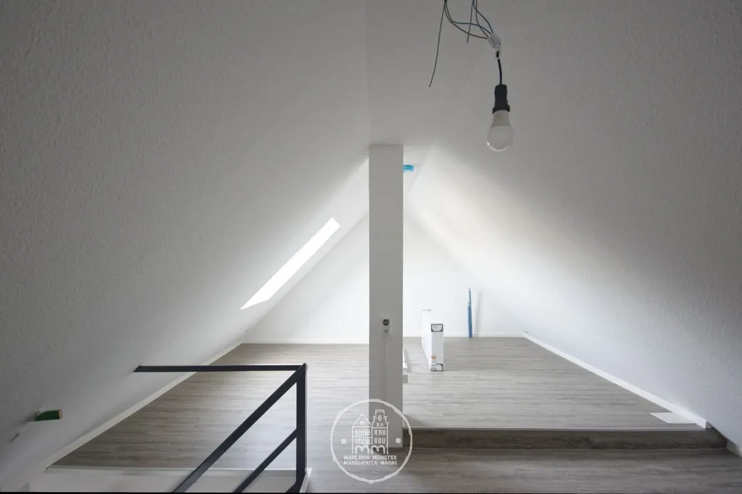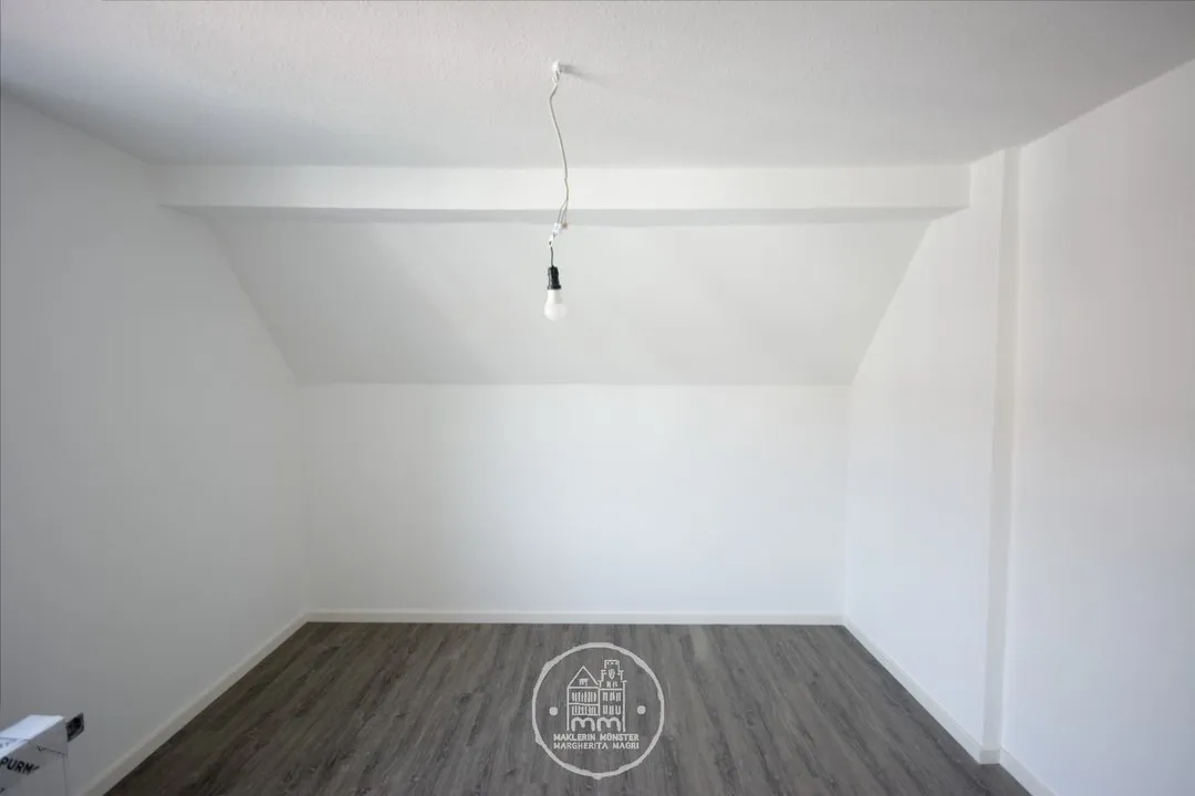Im Dachgeschoss gibt es ein Duschbad mit Fenster und drei Schlafräume mit gemütlichen Schrägen. Der Raum zum Garten hat eine innenliegende Treppe die auf eine Empore im Dachfirst führt. Diese Räume sind mit hochwertigen Vinyl-Boden in Holzoptik ausgelegt.