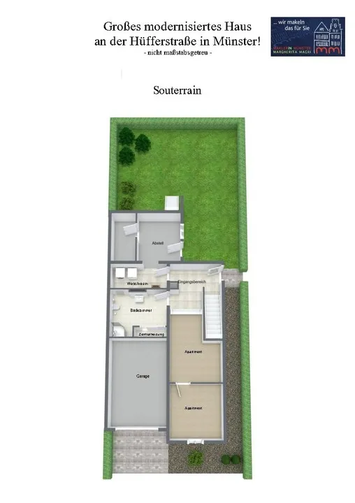 Im Eingangsbereich befinden sich im Halbsouterrain zwei hintereinander liegende Zimmer und ein Bad, die sich als Büro oder separates Apartment anbieten. Auf gleicher Ebene gibt es zwei Kellerräume und eine Garage (die sich leider mit einem Auto nicht befahren lässt).