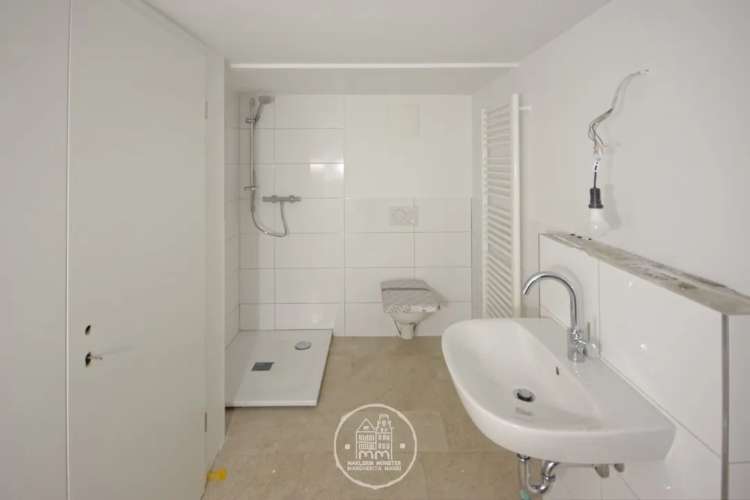 Im zweiten Geschoss befindet sich die große offene Küche mit dem angrenzendem Esszimmer, indem die gesamte Familie Platz zum Essen findet. Ein weiterer separater Raum mit Balkon und Bad "en Suite" würde sich idealerweise als Schlafzimmer anbieten. Dieses Badezimmer mit Badewanne ist auch vom Flur erreichbar.