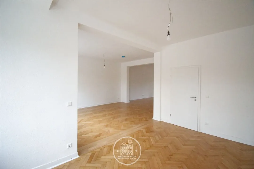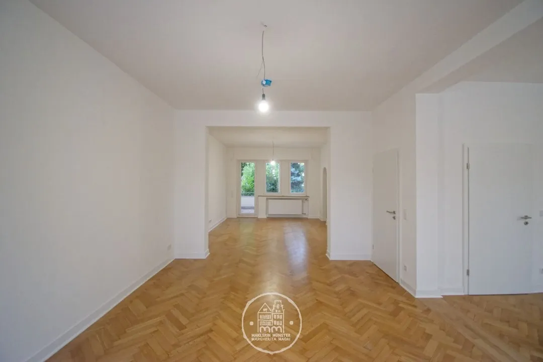 Über die liebevoll aufgearbeitete Original-Eichentreppe gelangt man in des erste Obergeschoss, die "belle Etage", wo sich drei ineinander übergehende offene Räume befinden. Diese repräsentativen hellen Räume mit ca. 55m² Gesamtfläche bieten sich als Wohnräume, Büro, Ausstellung etc. an. Hier wurde das originale Fischgrätparkett aufwändig überarbeitet. Des weiteren befinden sich auf dieser Ebene sich ein Gäste-WC und die überdachte Terrasse mit dem Zugang zum Garten. Der Garten würde sich über Nutzer mit einem "grünem Daumen" freuen.