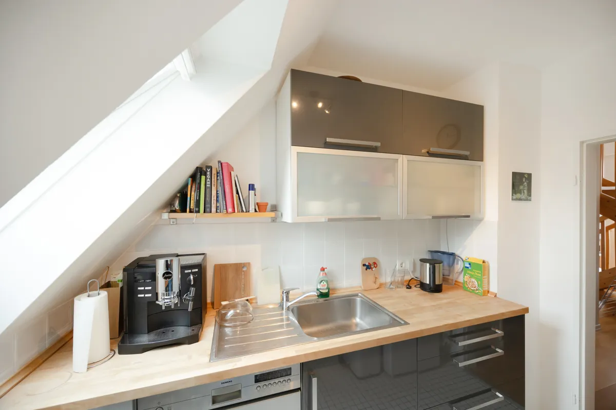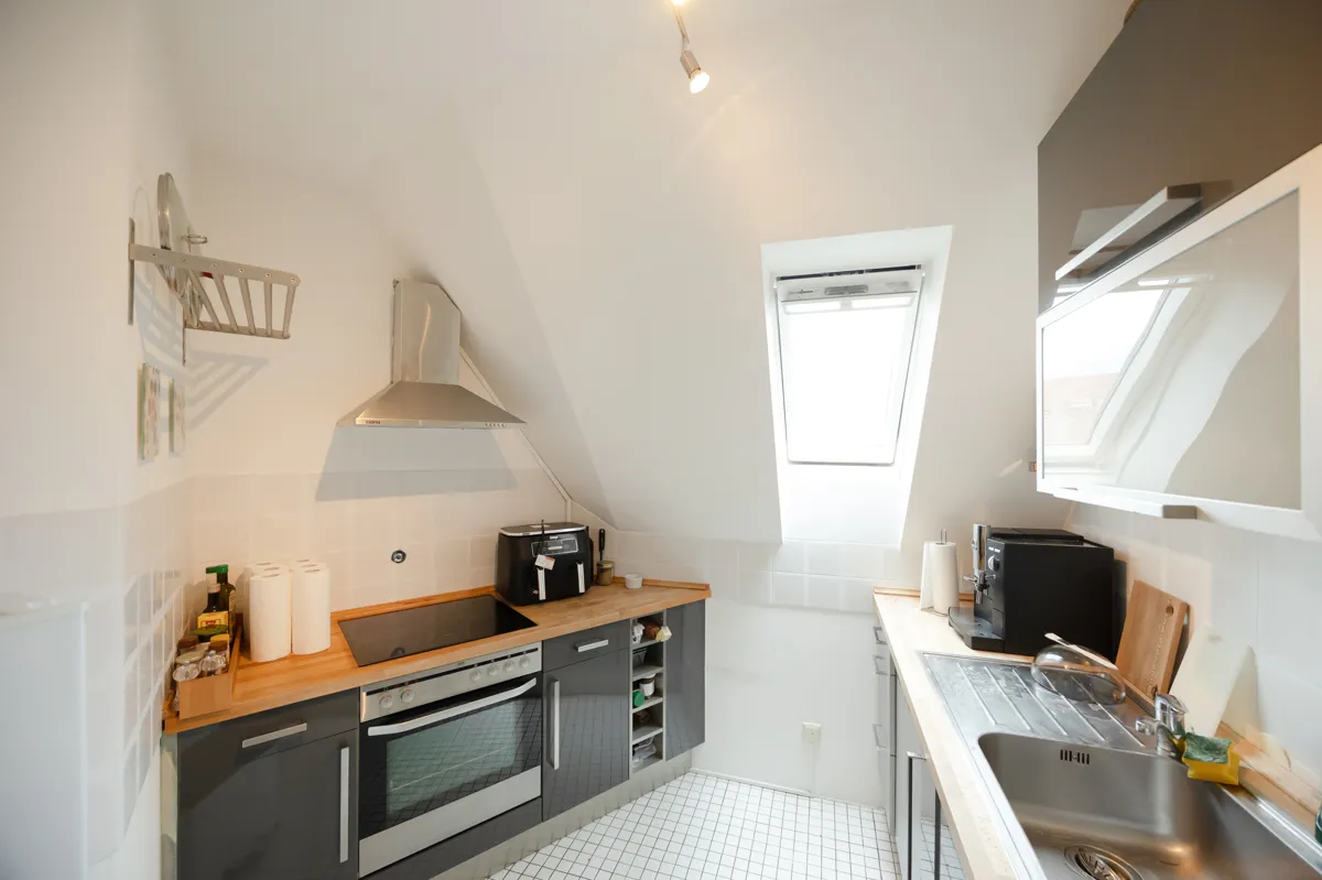 Ein Cabriofenster mit bestem Ausblick über die Dächer der Innenstadt befindet sich zudem in der oberen Etage der Dachgeschosswohnung.