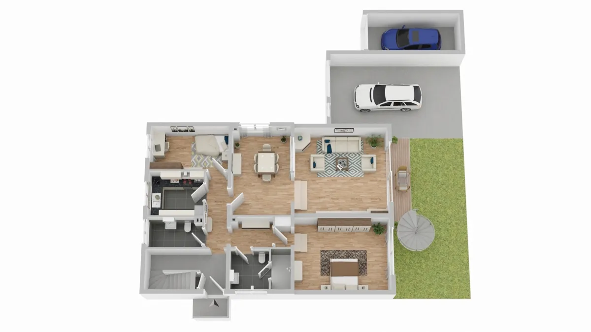 Die Wohneinheit im Erdgeschoss bietet auf 98 m² Wohnfläche, Wohn-Esszimmer, Büro, Schlafzimmer, Küche, Bad, Gäste-WC und einen direkten Zugang zu einem liebevoll gestalteten Zier- und Nutzgarten, der sich ideal für Entspannung und gesellige Sommerabende anbietet.